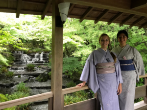 着物を着て、好古園を散策しました。好古園の粋な計らいで、お抹茶とお菓子をいただきました。