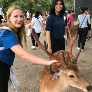 奈良県へ1日旅行に行きました。奈良公園では、元気な鹿たちに熱烈に歓迎してもらいました。世界中からの観光客や修学旅行生も大勢いて、とてもにぎわっていました。