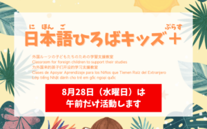 8月28日水曜日の日本語ひろばキッズ+は、午前(10:30~12:00)だけ行います。
