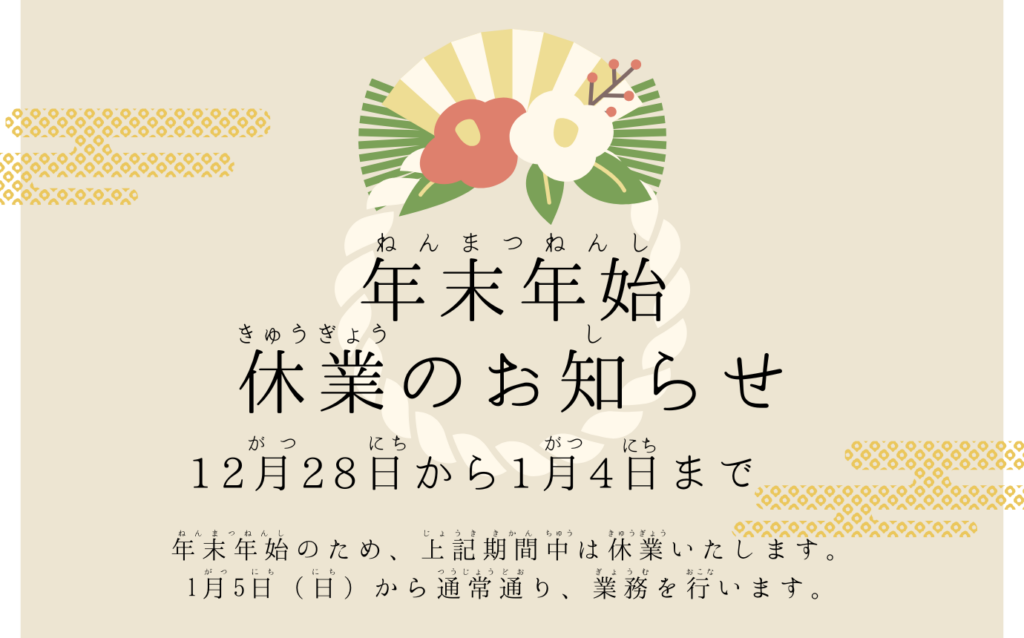 姫路市文化国際交流財団国際交流担当(イーグレひめじ内事務所)は、2024年12月28日(土曜日)から2025年1月4日(土曜日)まで休業いたします。 新年は1月5日(日曜日)から対応いたします。 ※イーグレひめじの休館日も、2024年12月28日(土曜日)から1月4日(土曜日)までです。