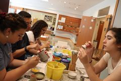 書写山の麓にある書写の里工芸館でコマの絵付け体験。