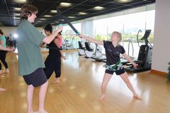 写真はエアー・ソフト剣を使ったスポーツチャンバラをしているところです。