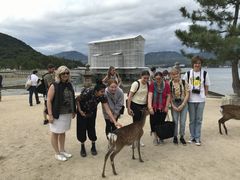 厳島神社の大鳥居は残念ながら修復工事中でしたが、鹿の乱入に大喜びの生徒たちです。