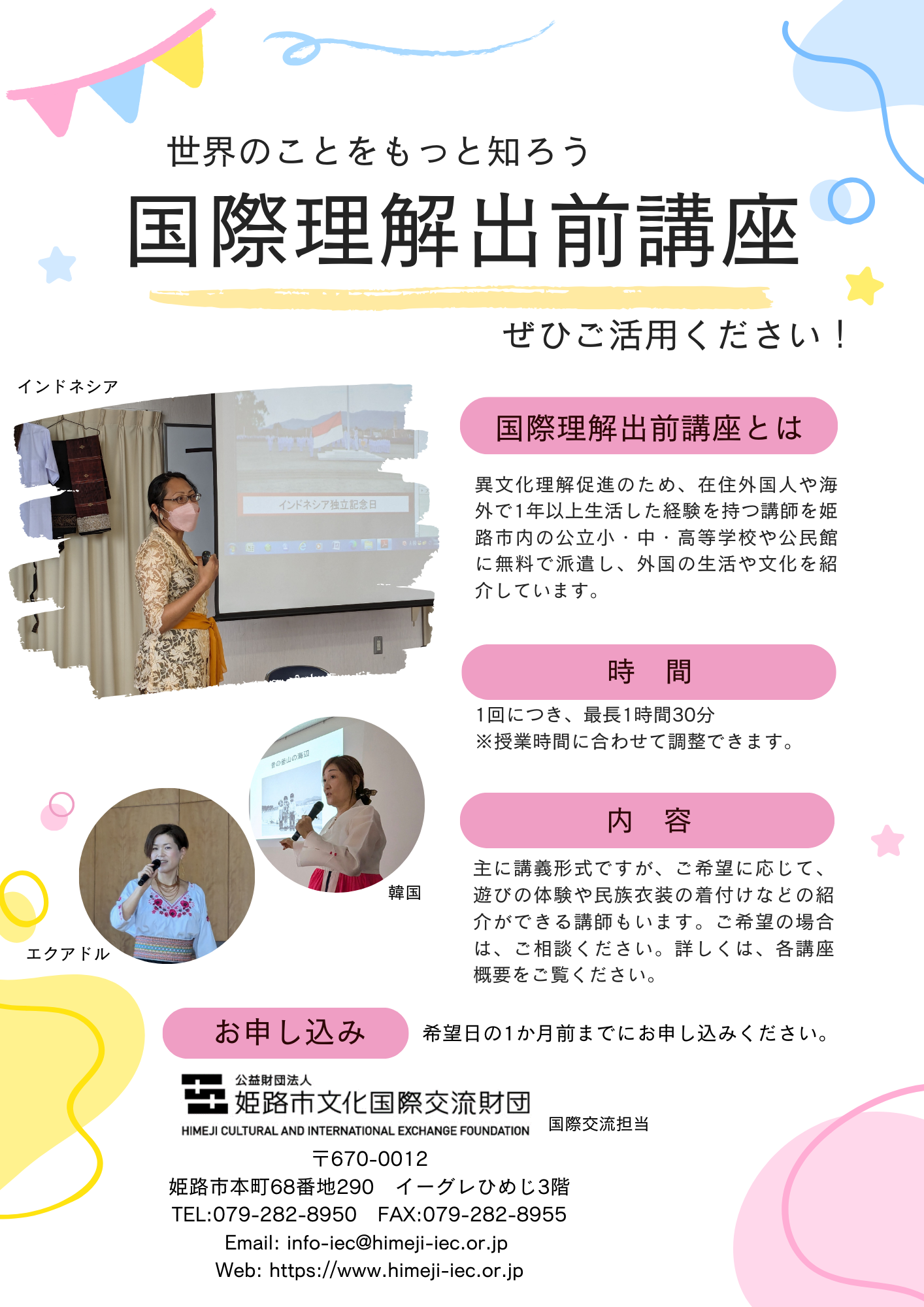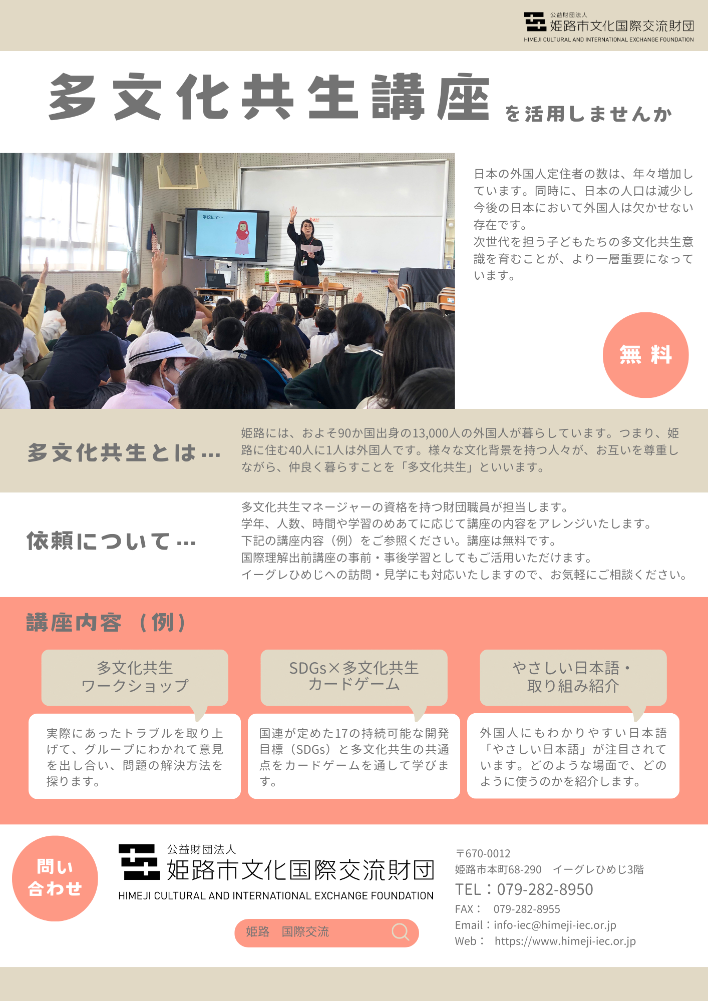 公益財団法人姫路市文化国際交流財団(国際交流担当) 〒670-0012 姫路市本町68番地290 イーグレひめじ3階 TEL:079-282-8950 / FAX:079-282-8955