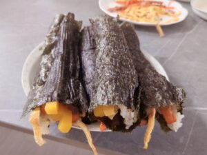 朝からホストシスターと家の近くにあるスーパーにキンパを作るための材料を買いに行きました。韓国のスーパーは日本のスーパーより商品棚が高く、通路の間隔が狭かったです。スーパーでは、海苔、ハム、卵、キュウリ、たくあん、ゴボウを買いました。私はキンパを作るのが初めてで、ホストシスターもホストマザーがいないときにキンパを作るのは初めてなので、2人とも不安でしたが、思っていたよりも簡単で上手にできたなと思いました。自分たちで作ったキンパは、すごくおいしかったです。