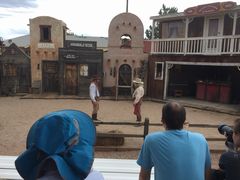 今日は”Tombstone”という町に行きました。町並みは映画などで見るような景色で、カウボーイや馬車、レトロなドレスを着た婦人が実際に歩いていたので、まるで自分が18世紀の西部劇の世界 に入ったかのようでした。実際にここで撮影された映画が何本もあるそうです。馬が大好きな10歳のホストシスターは馬車を見て、とても興奮していました。 また、”Gunfight”という拳銃による決闘のショーを見ました。出てくる役者さんは全員、カウボーイ特有の訛りのある英語で話していました。ショーでは銃を撃つと大音量の発砲音が鳴り響き、迫力満点でした。会場全体が一体となって笑ったり、悪者に対してブーイングをしたりして本当に楽しかったです。