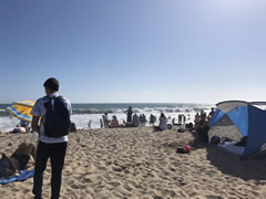 到着してから水着に着替えて、ビーチに行きました。太平洋の向こうには島が無く、地平線が綺麗に丸く見えました。私は海に入るのが初めてだったので、すごくわくわくしました。冷たくて気持ちよかったです。