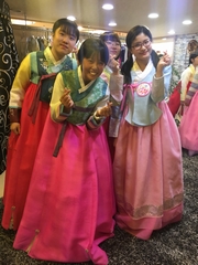 午後は、ハンボック(韓服)を着ました。すごく楽しみにしていたので本当に嬉しかったです。周りにいた韓国の友達みんなが『キヨー(かわいい)』と言ってくれました。着物のように、着るのにすごく時間がかかるのかと思ったら、5分ほどで着られたのでびっくりしました。20人ぐらいがハンボックを着たのですが、色や形、刺しゅうが一人ひとり、違っていて面白かったです。その後、ハンボックを着たまま、昌原の伝統的な家屋を見に行きました。敷地がとても広く、きれいな庭に囲まれた大きな家でした。たくさんの木や植物が植えてあり、日本と少し似ている所もありました。昌原の歴史や習慣をいろいろ教えてもらったのですが、一番印象的だったのは、韓国では脱いだままの方向で靴をそろえるということです。日本とは真逆で驚きました。
