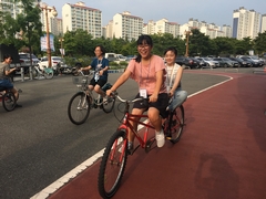 午後は、馬山博物館を見学した後、創洞「想像の道」に行きました。昔ながらの店やかわいい雑貨屋さんがあり、ペアの子たちとわいわい話しながら見て回って、とても楽しかったです。ヌビジャ(市の貸自転車システム。姫路でいう“姫ちゃり”)運営センターの見学にも行きました。そこには見たことのない変わり自転車がたくさん置いてあり、みんな特別に乗らせてもらって大はしゃぎでした。とても楽しかったです。