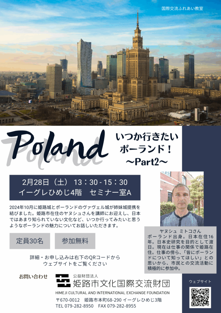 在住外国人を講師に招いて、その国の料理やお菓子、飲み物を楽しみながら、お話を聞き、身近に暮らす外国の人たちの文化に触れ、姫路の国際化に理解を深めるイベントを実施しています。