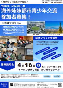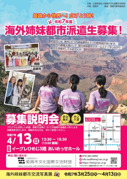 姫路市文化国際交流財団は、姫路市在住の中学生・高校生の応募者から姫路市の親善大使として選抜し、姉妹都市へ派遣します。
